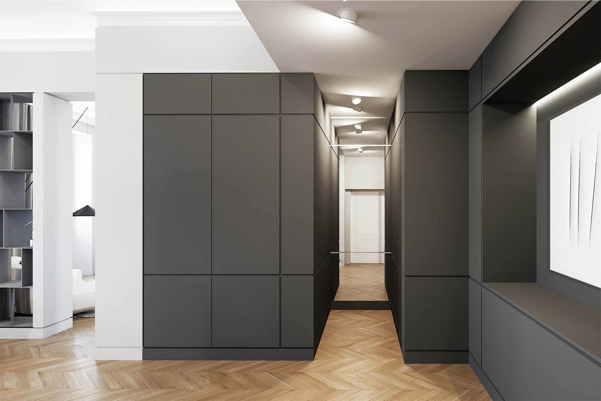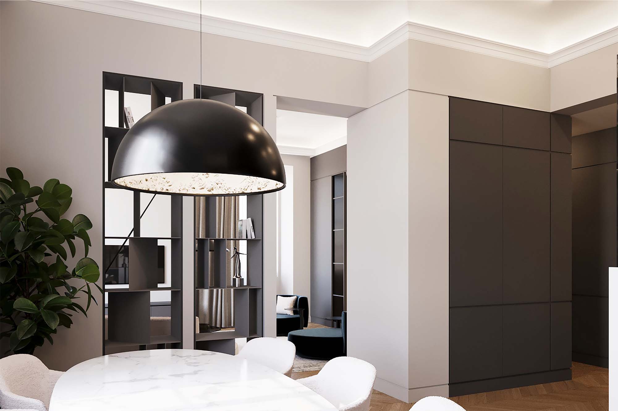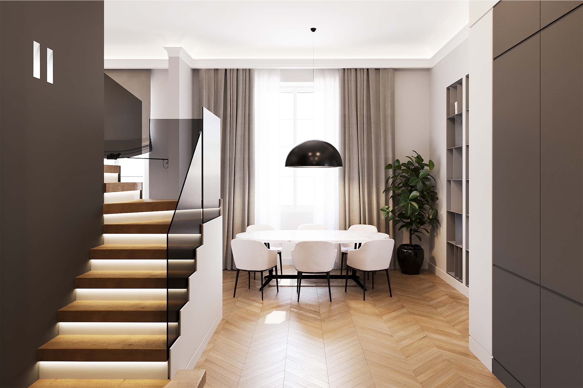 Il dialogo tra pareti e controsoffitti diventa un gioco raffinato, dove tende e impianti restano invisibili, nascosti con eleganza.