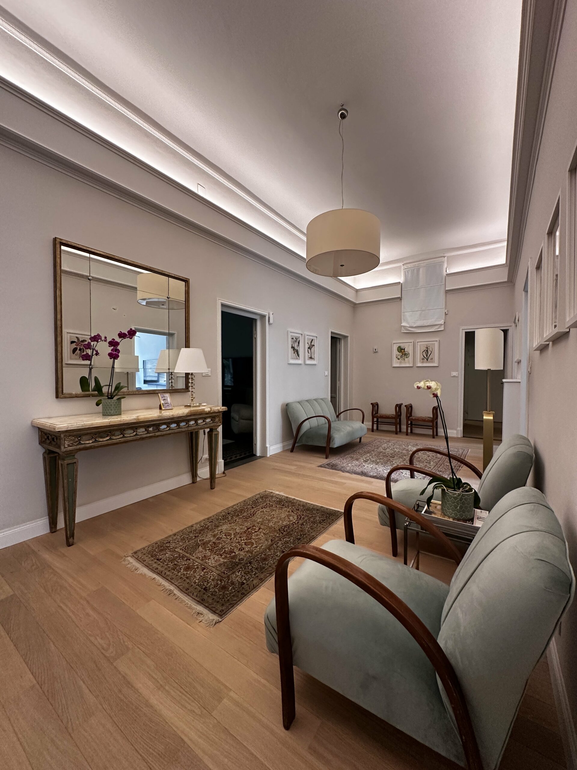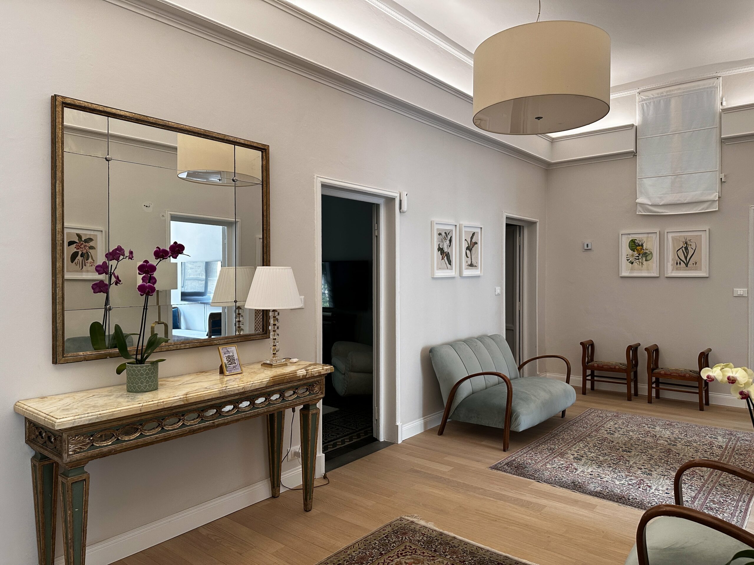 Uno degli aspetti più interessanti è stata la gestione dei pavimenti: abbiamo deciso di rispettare le maioliche esistenti, che raccontano la storia dell’appartamento, integrandole con un nuovo parquet che aggiunge calore e continuità agli ambienti. Il risultato è un equilibrio perfetto tra tradizione e modernità.