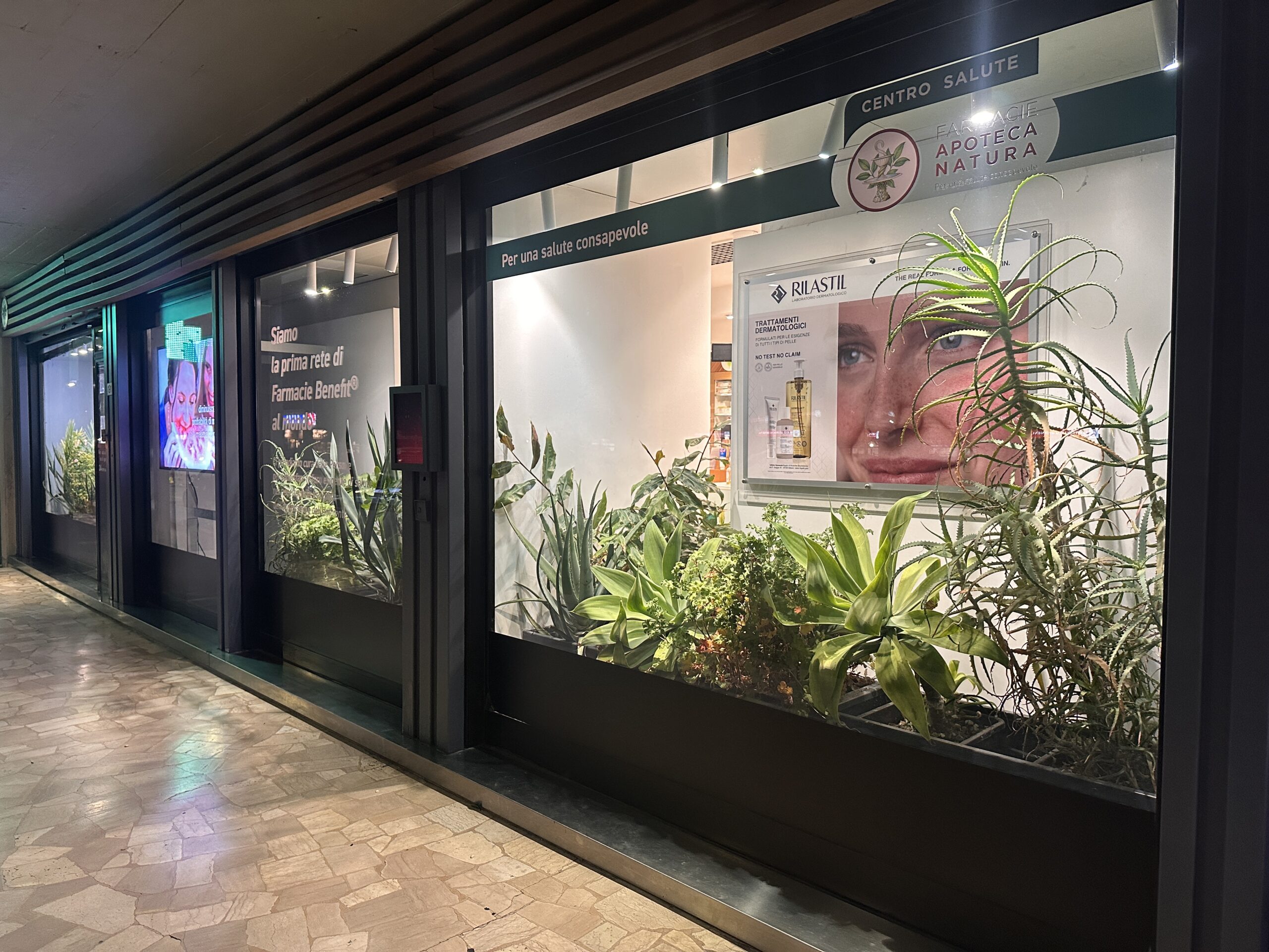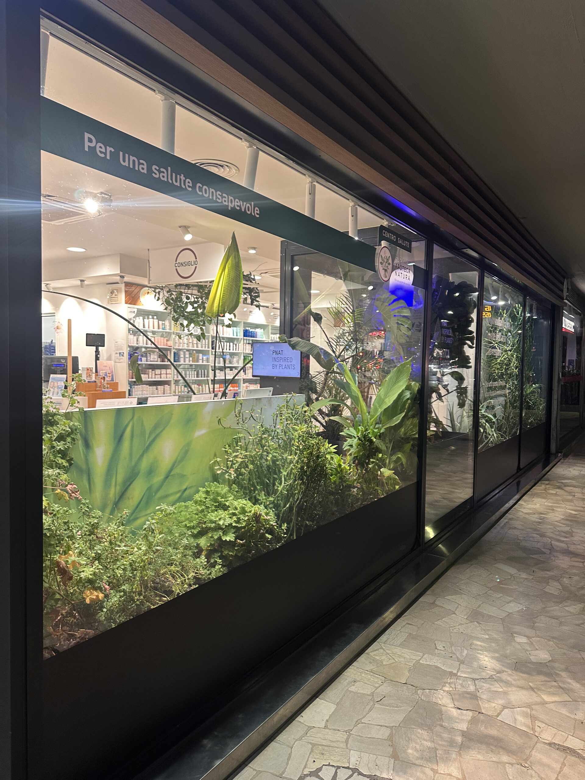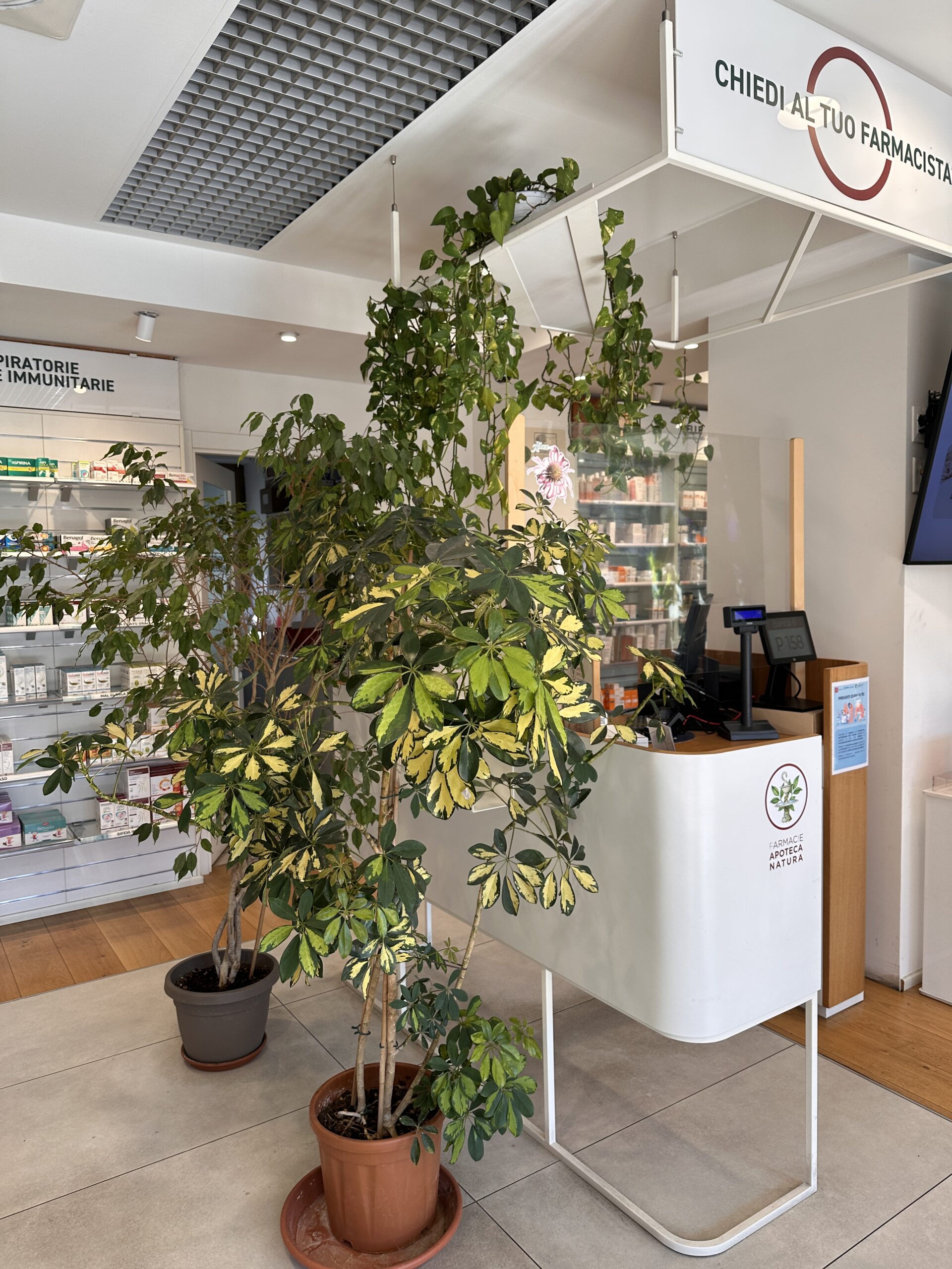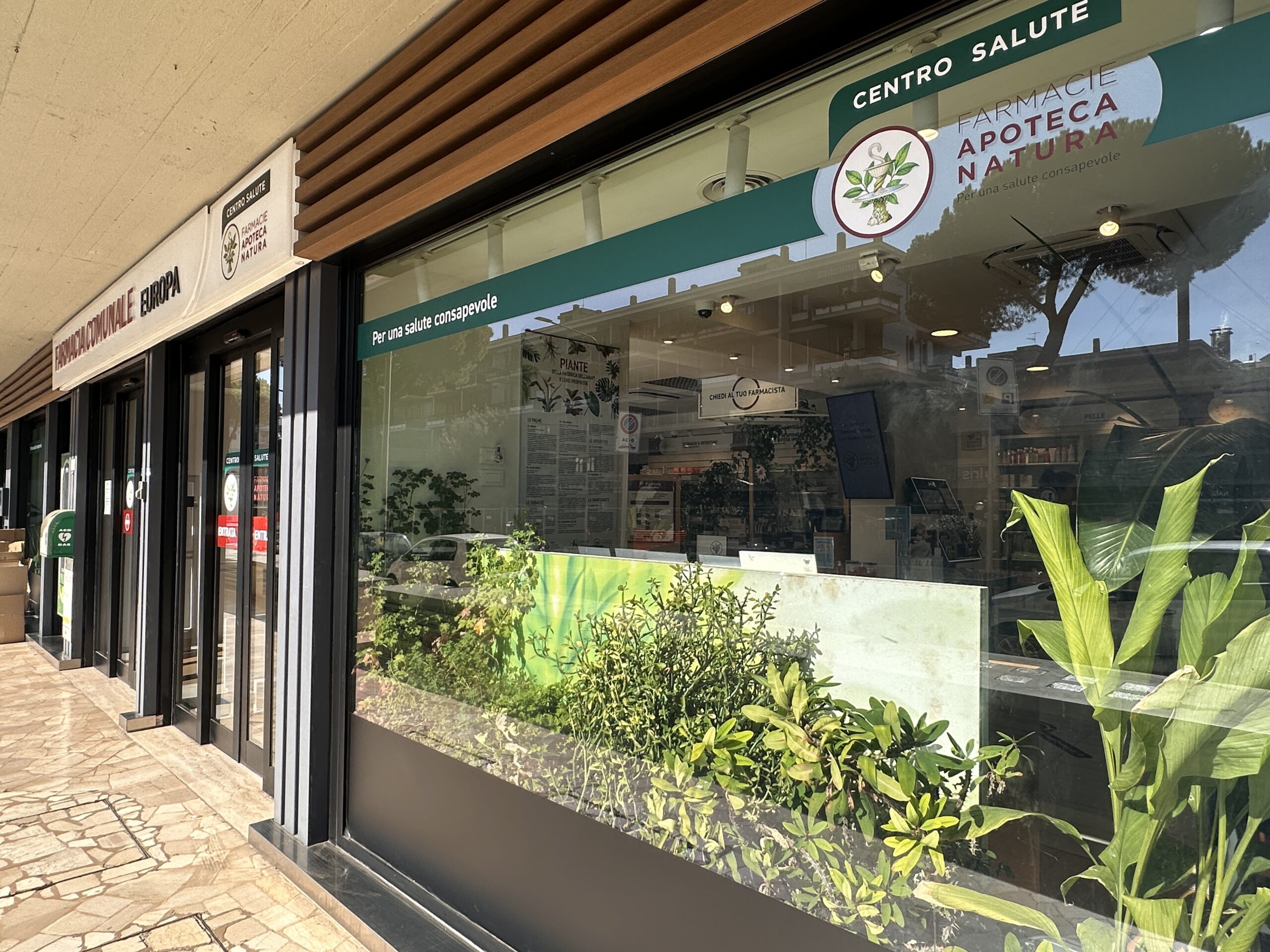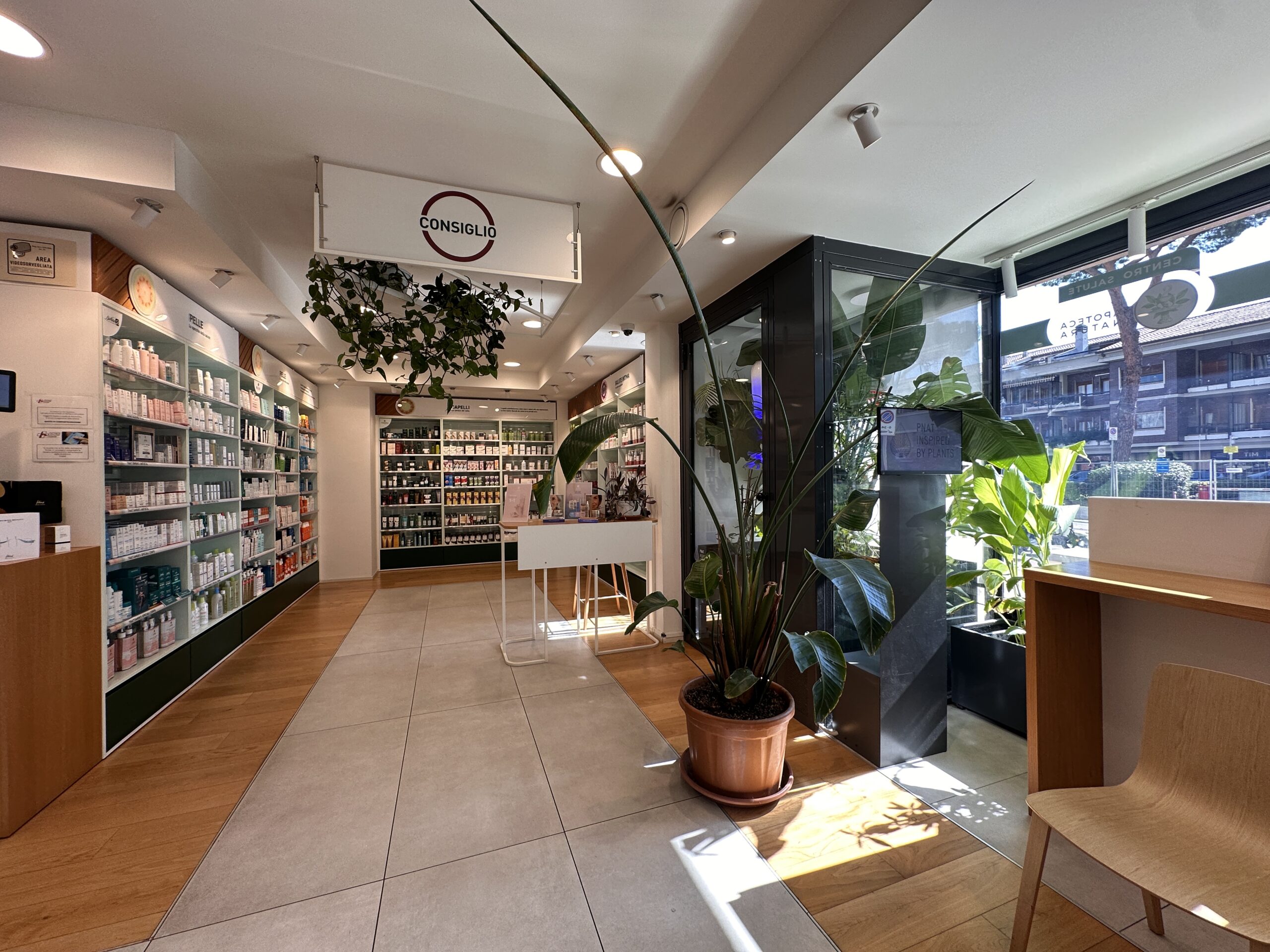 Ma l’innovazione non è solo strutturale. Il cuore pulsante di questa riqualificazione risiede nel restyling architettonico, eseguito in piena aderenza al concept ‘Apoteca Natura’. Abbiamo voluto creare un ambiente che andasse oltre la semplice dispensazione, focalizzandoci sul benessere integrato. Per questo, gli interni sono stati plasmati utilizzando legno e pietra, materiali che infondono calore e naturalità.
