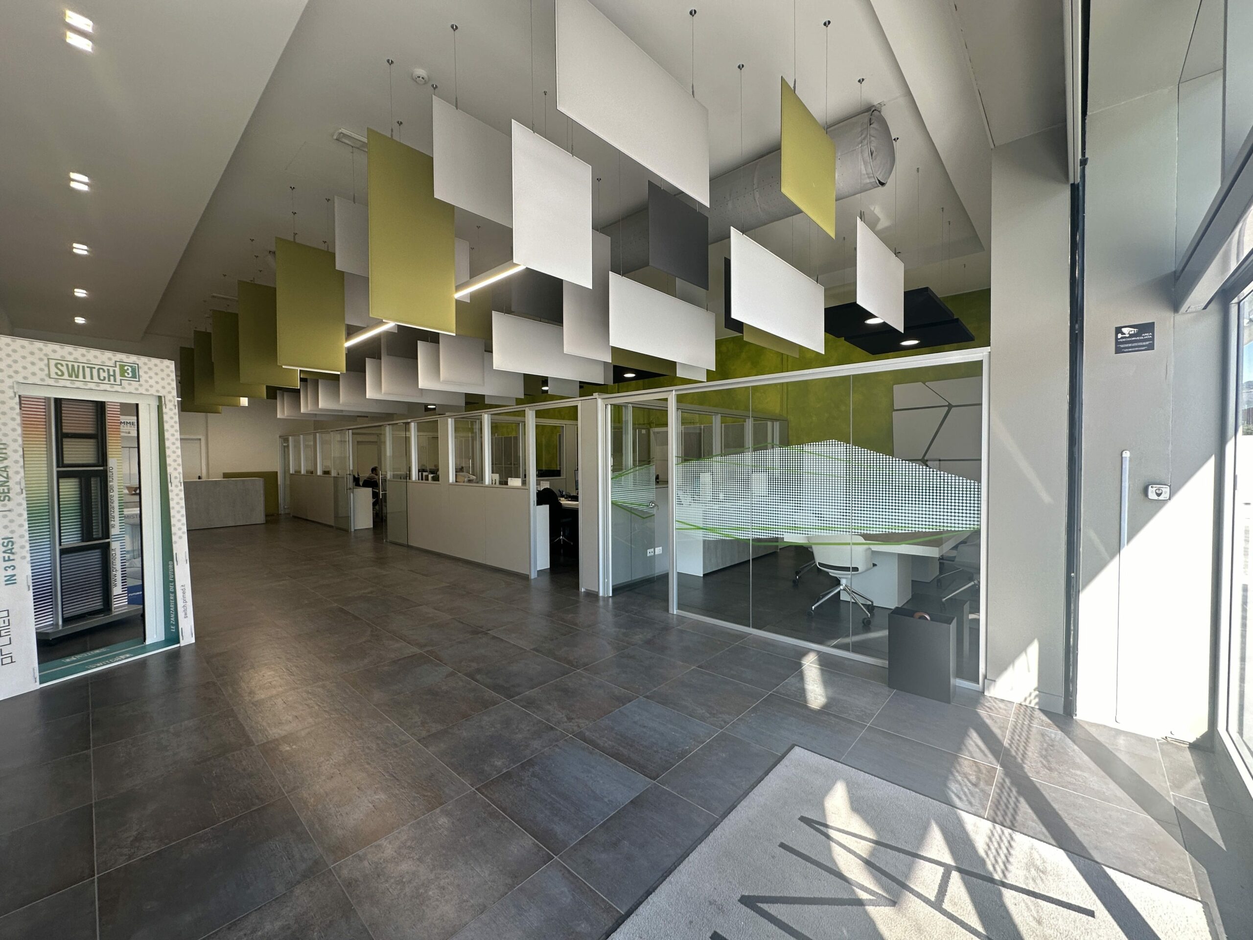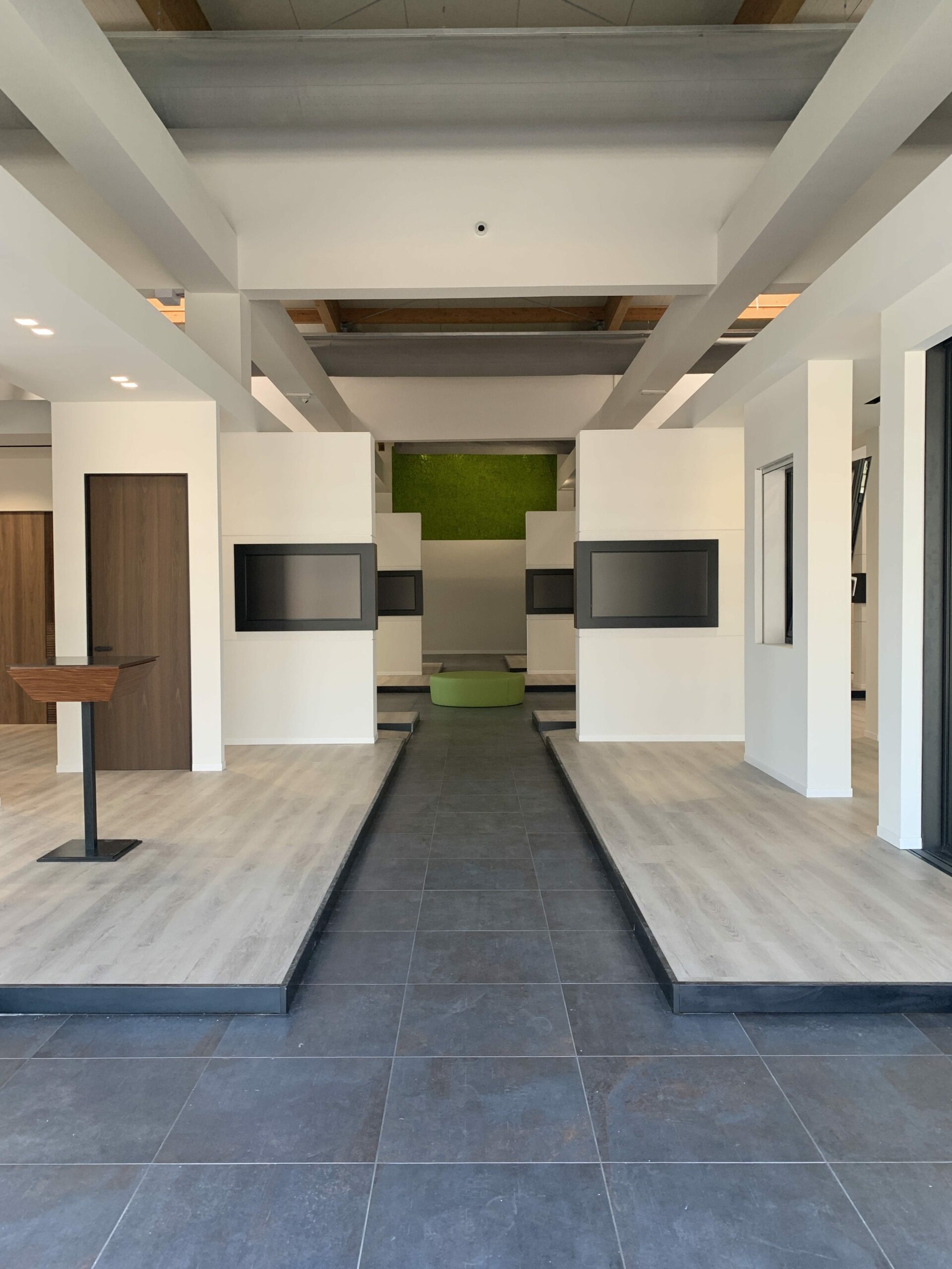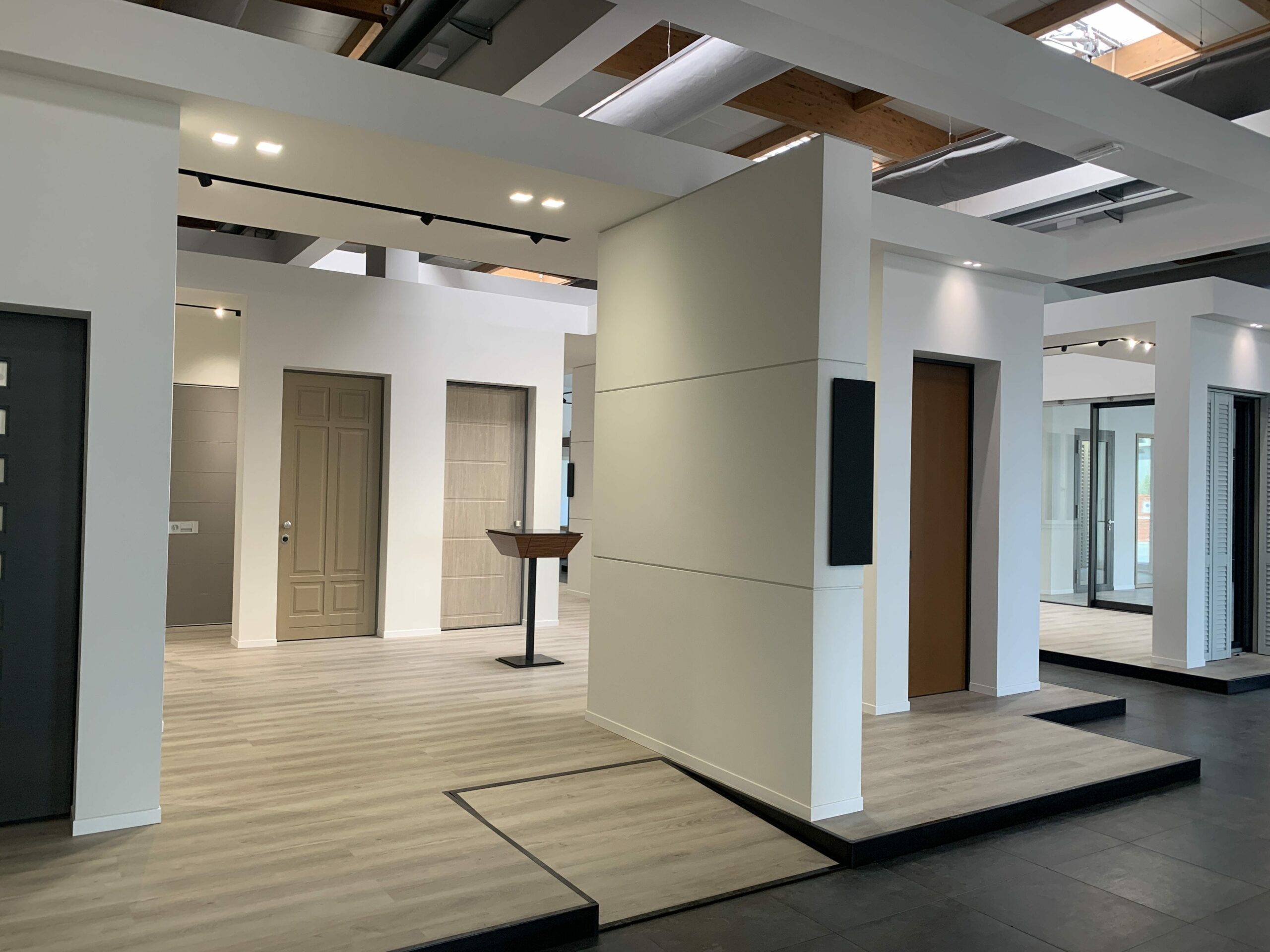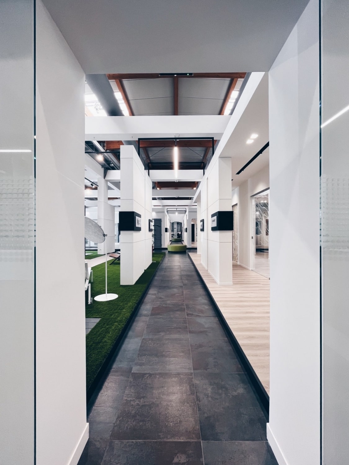 Abbiamo curato ogni dettaglio per massimizzare la resa estetica e funzionale. Questo ha richiesto un attento studio dei materiali, la selezione di idonei sistemi di controsoffittatura e, in particolare, un rigoroso studio illuminotecnico, essenziale per valorizzare i prodotti e conferire al polo espositivo un impatto visivo e professionale di alto livello.