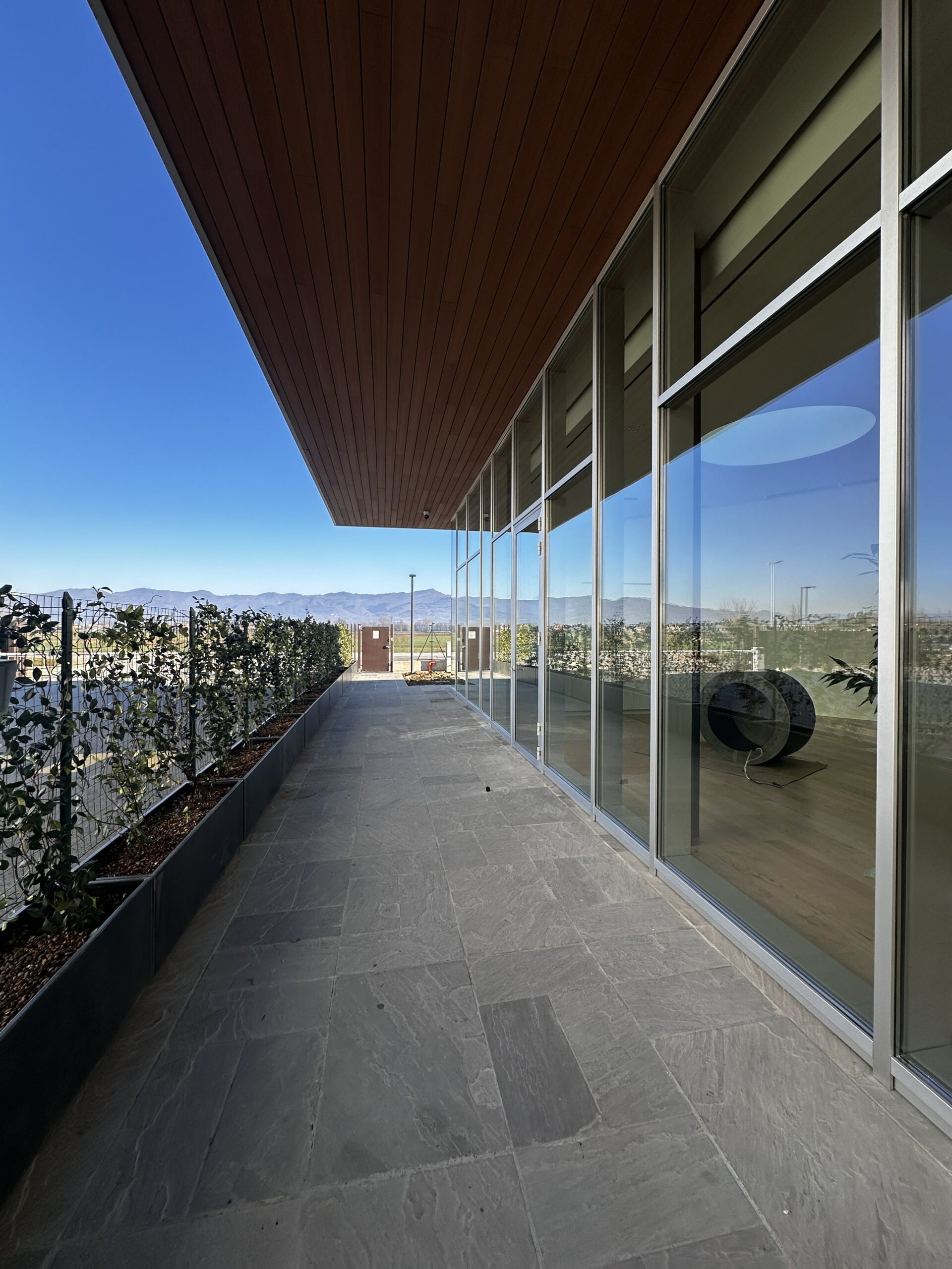 Le ampie e alte vetrate conferiscono un aspetto di notevole leggerezza alla struttura, garantendo al contempo un’abbondante illuminazione naturale degli spazi interni, oltre a garantire una vista a 180 gradi.