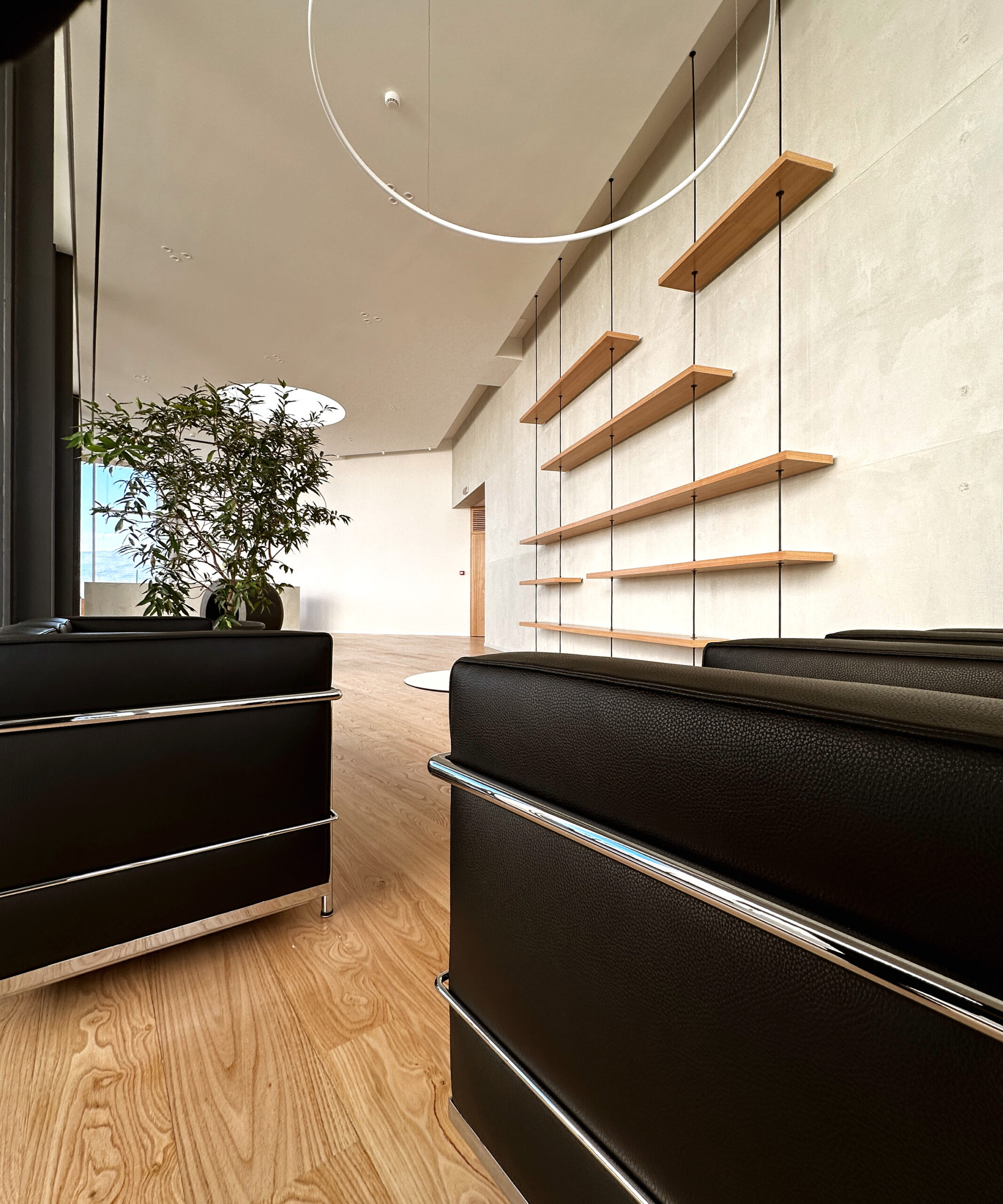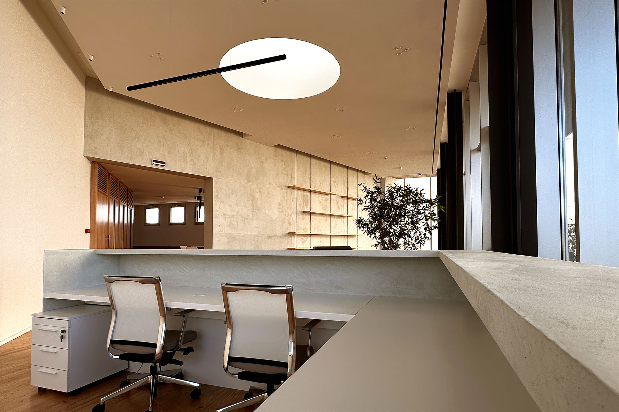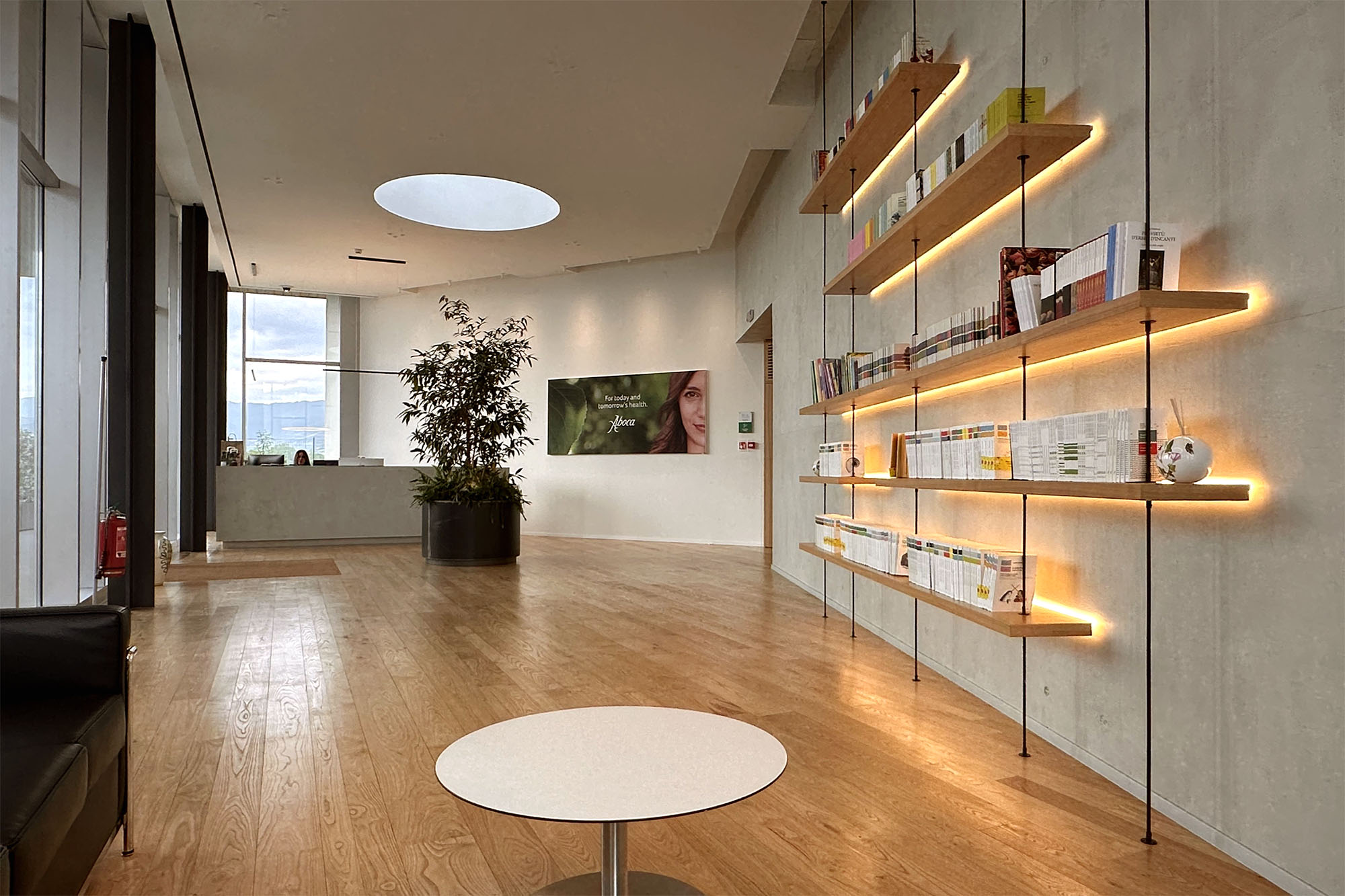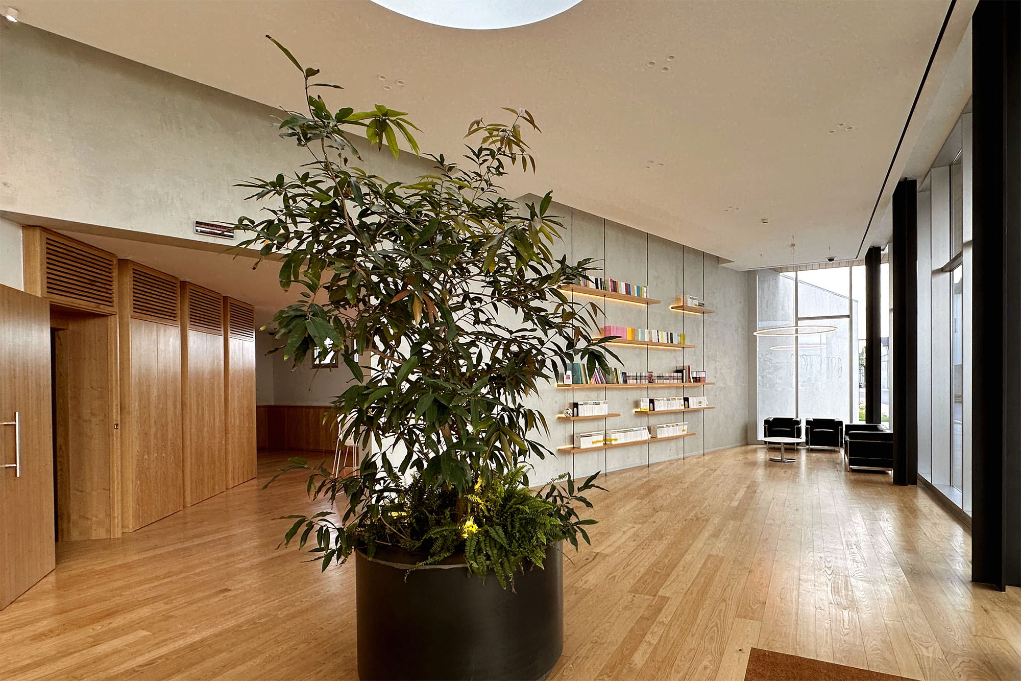 Un lucernario è stato integrato nella copertura al fine di fornire luce diretta al fulcro centrale dell’ingresso, evidenziando la funzione nevralgica di questo punto e fornendo luce alle piante situate all’interno dello spazio.