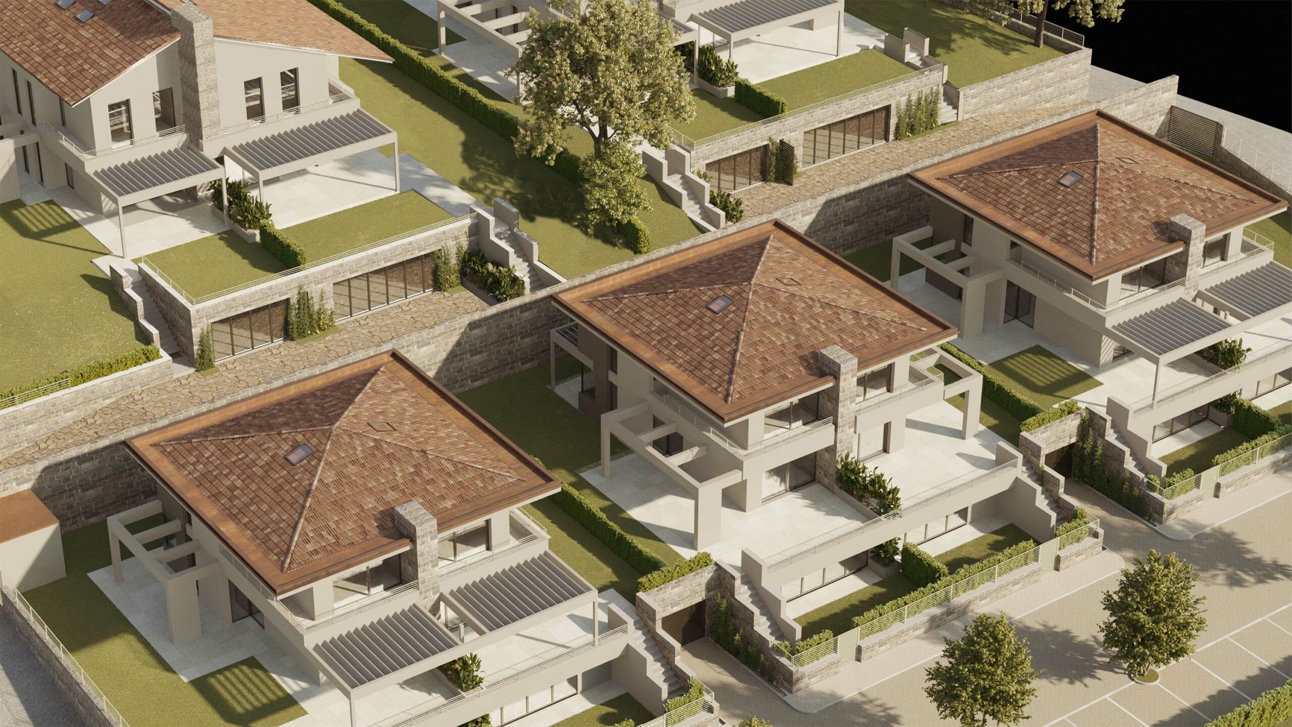 Un elemento distintivo del progetto è l’attenzione all’integrazione con il contesto paesaggistico e al comfort termico. Ogni villa è dotata di un’ampia area verde pertinenziale e di generosi spazi esterni privati.
