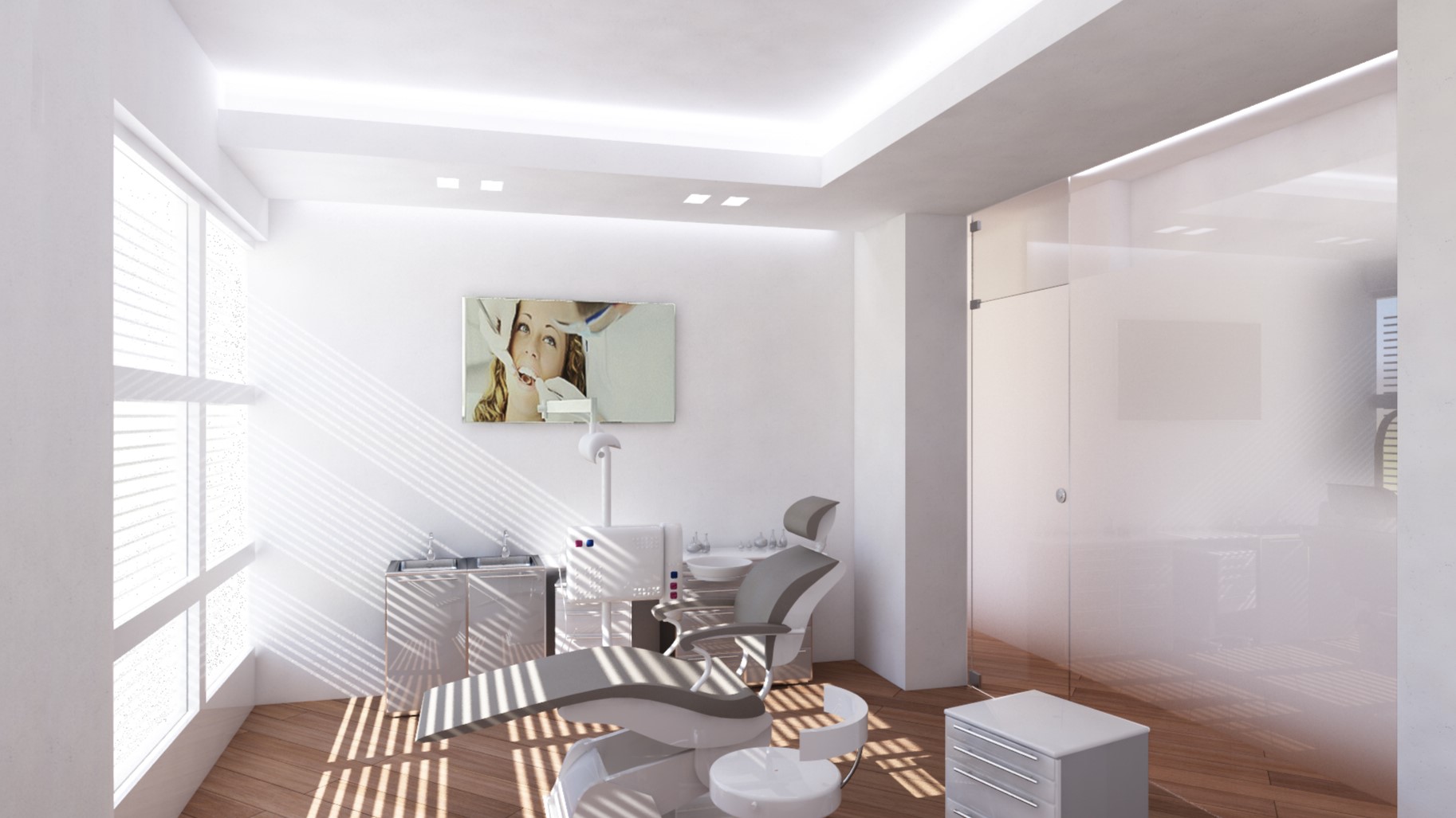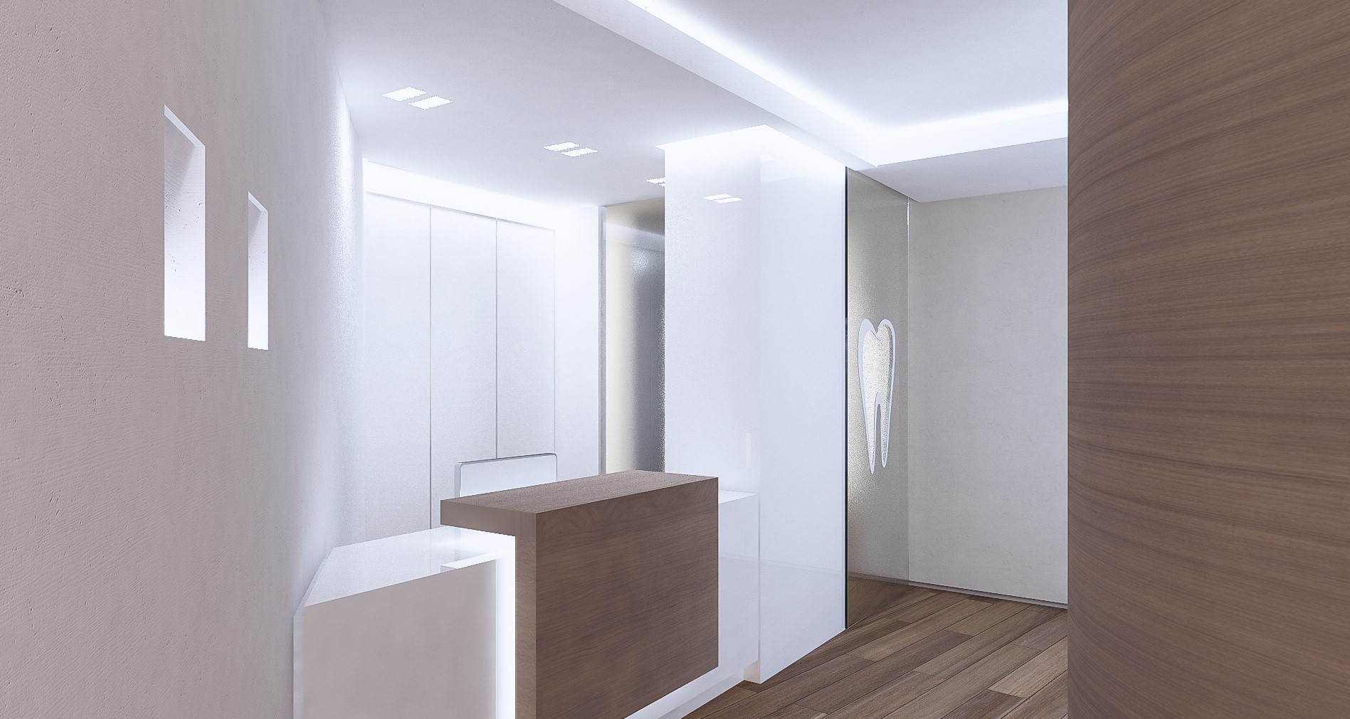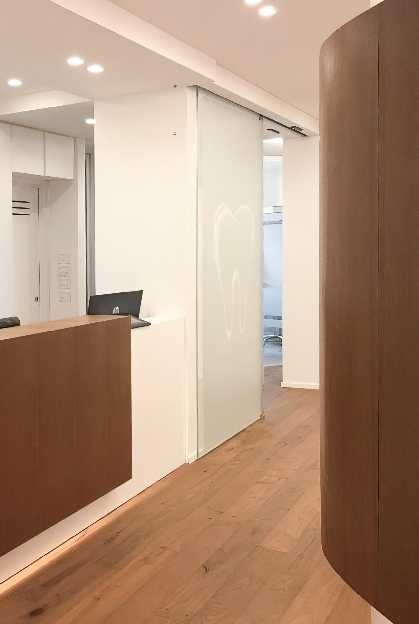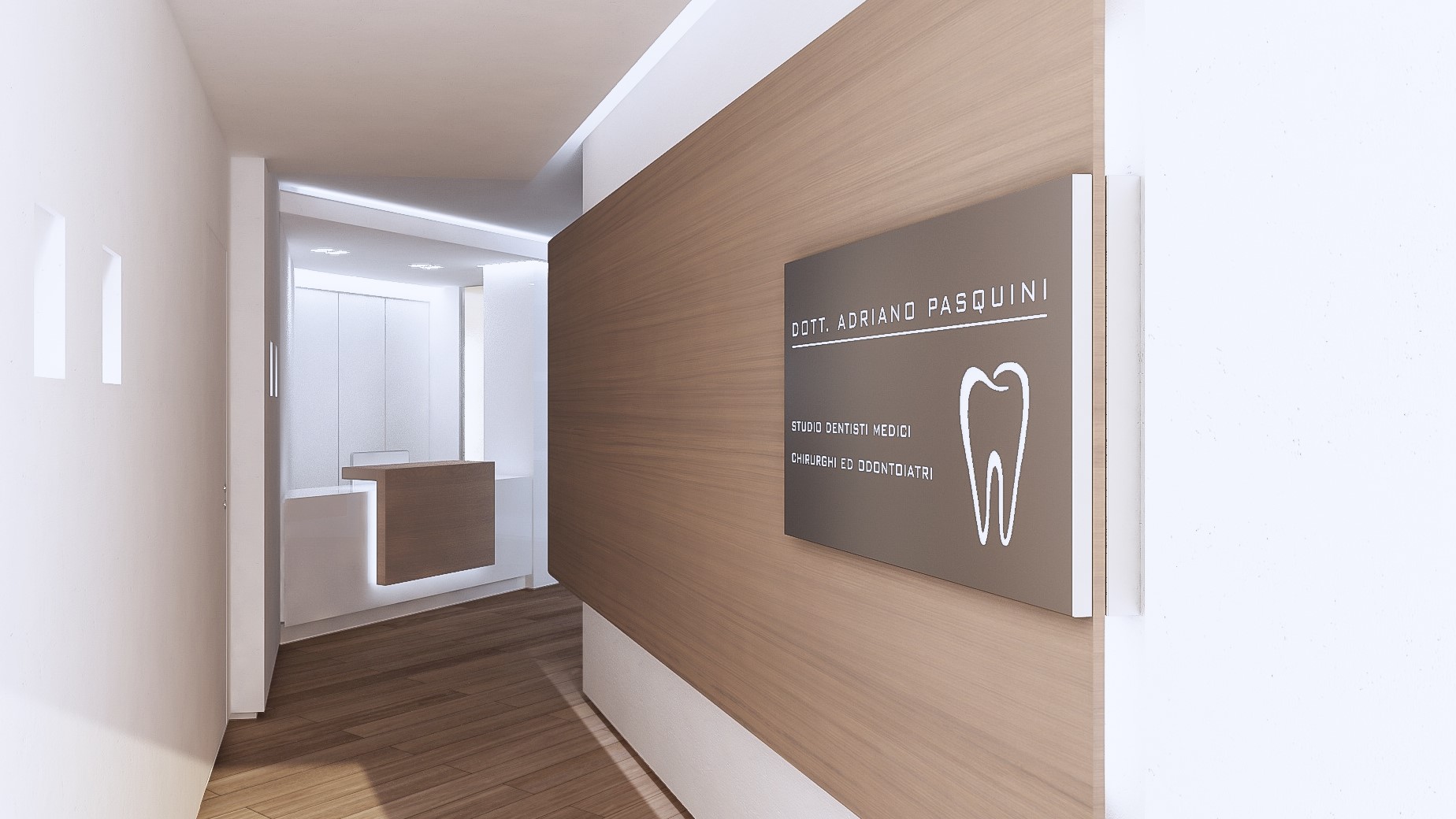 Il progetto per questo studio dentistico è stato sviluppato a partire da un brief specifico del cliente, che privilegiava l’impiego di materiali distintivi e di alto pregio: legno, metallo e vetro.