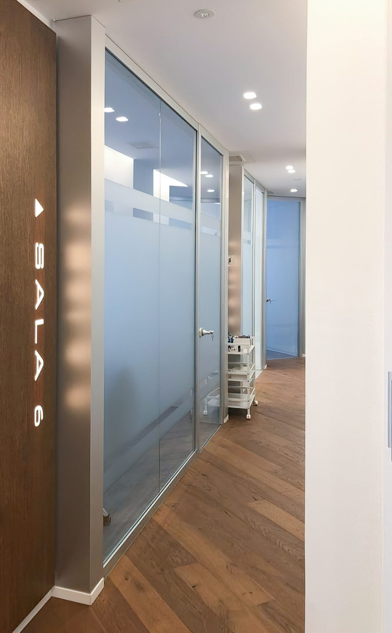 - Gestione della Privacy e Luminosità: Le ampie superfici vetrate, cruciali per la diffusione della luce naturale, sono state trattate con l’applicazione di pellicole decorative o schermanti. Questa soluzione ha permesso di modulare in modo discreto la trasparenza, assicurando la necessaria privacy negli ambienti clinici e operativi, senza compromettere la luminosità complessiva degli interni.