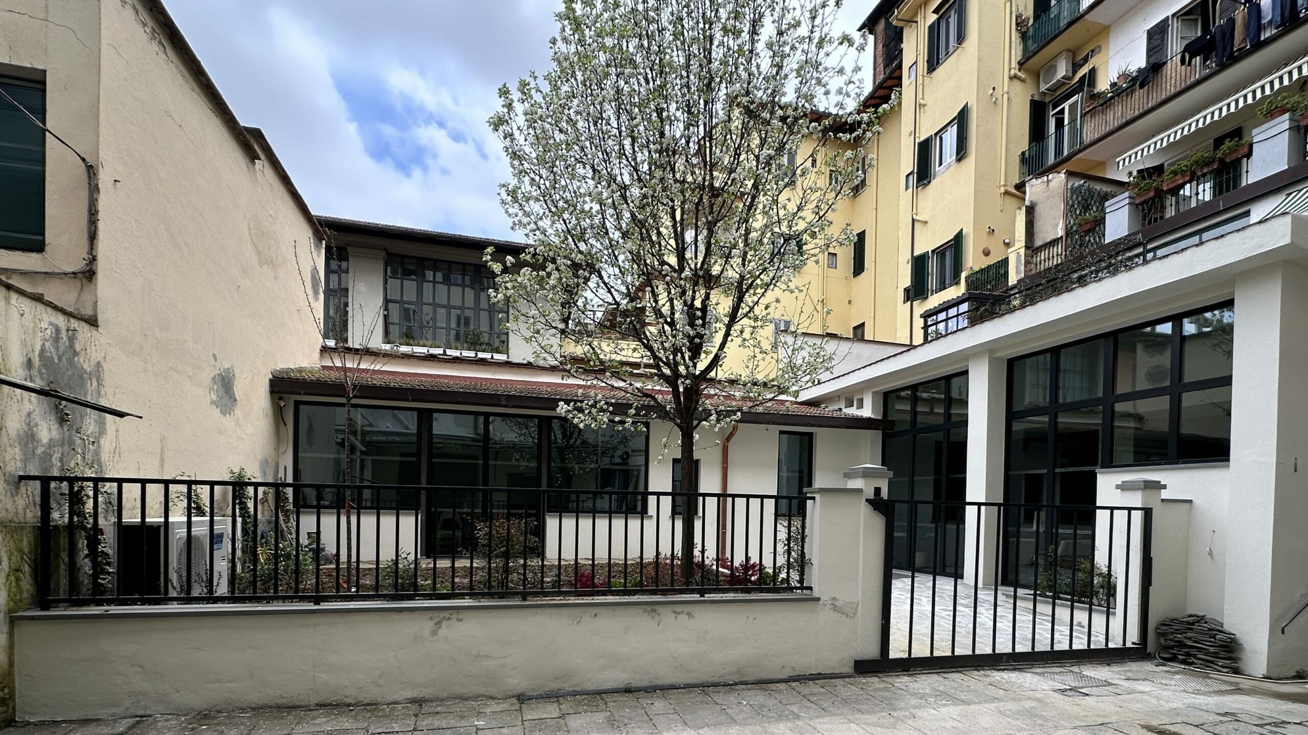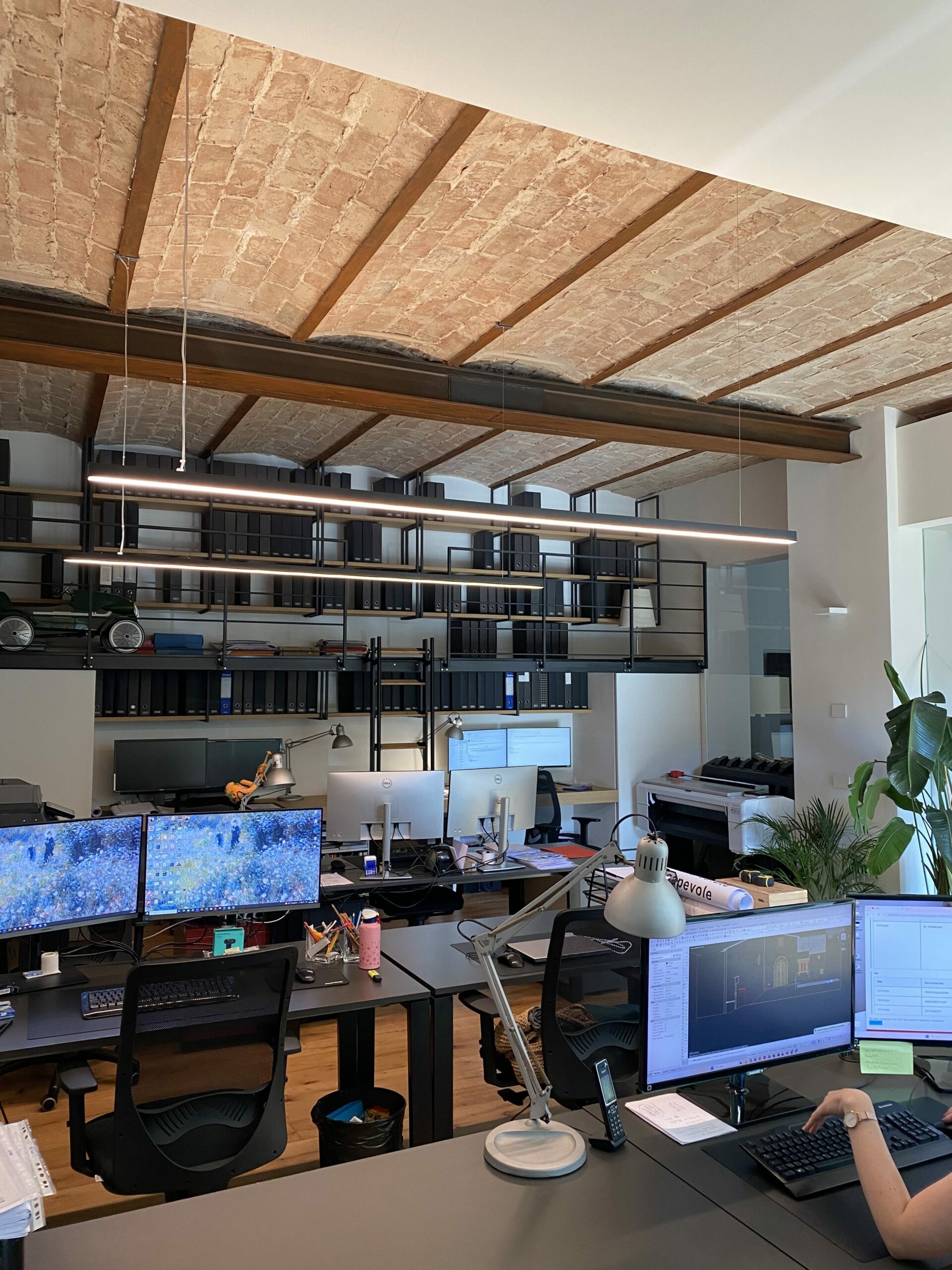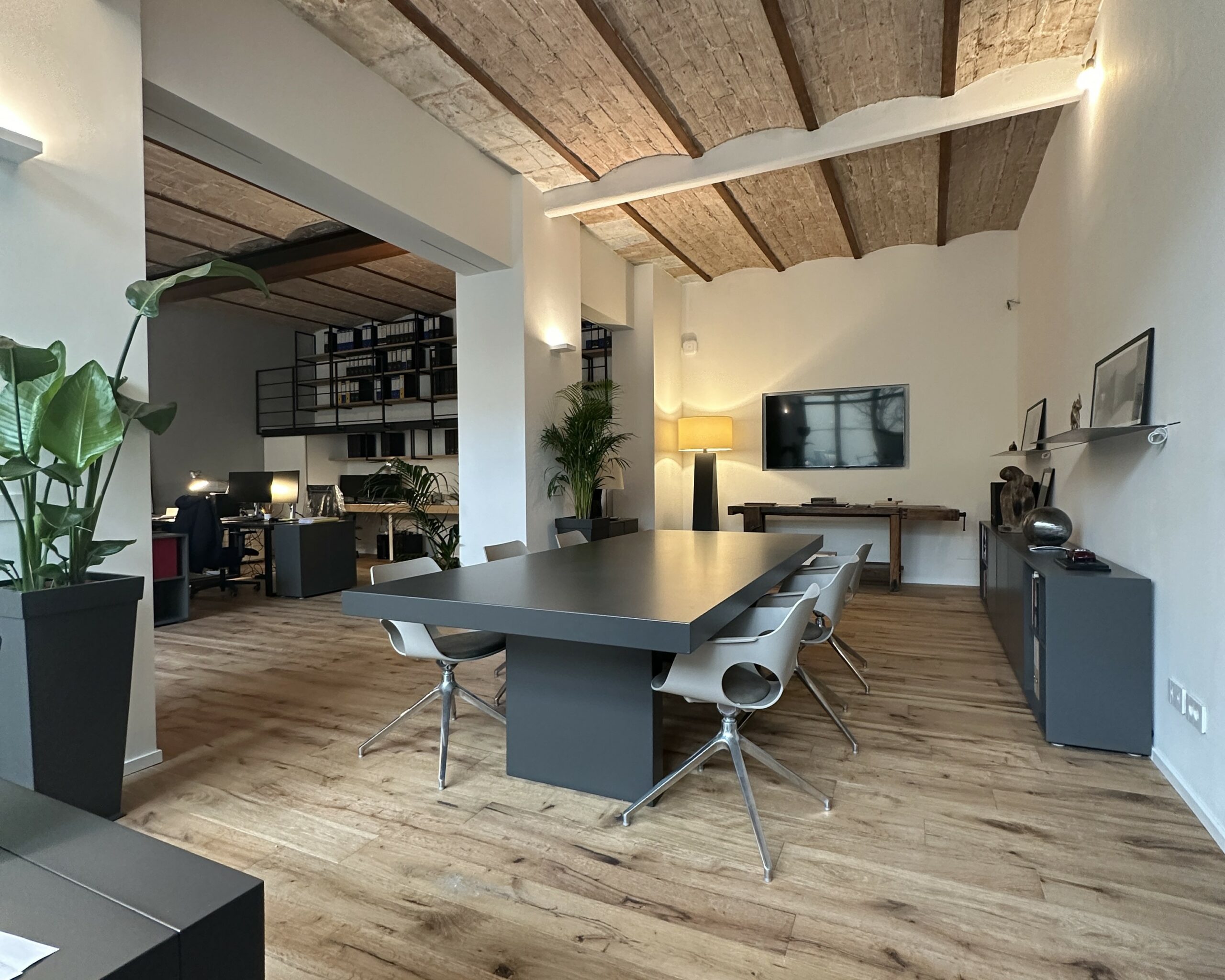 Nella ristrutturazione abbiamo valorizzato le volte in mattoni, riportandole al loro splendore originario, inserito un parquet caldo ed elegante e scelto il grigio come colore predominante, per conferire allo spazio un carattere contemporaneo e raffinato.