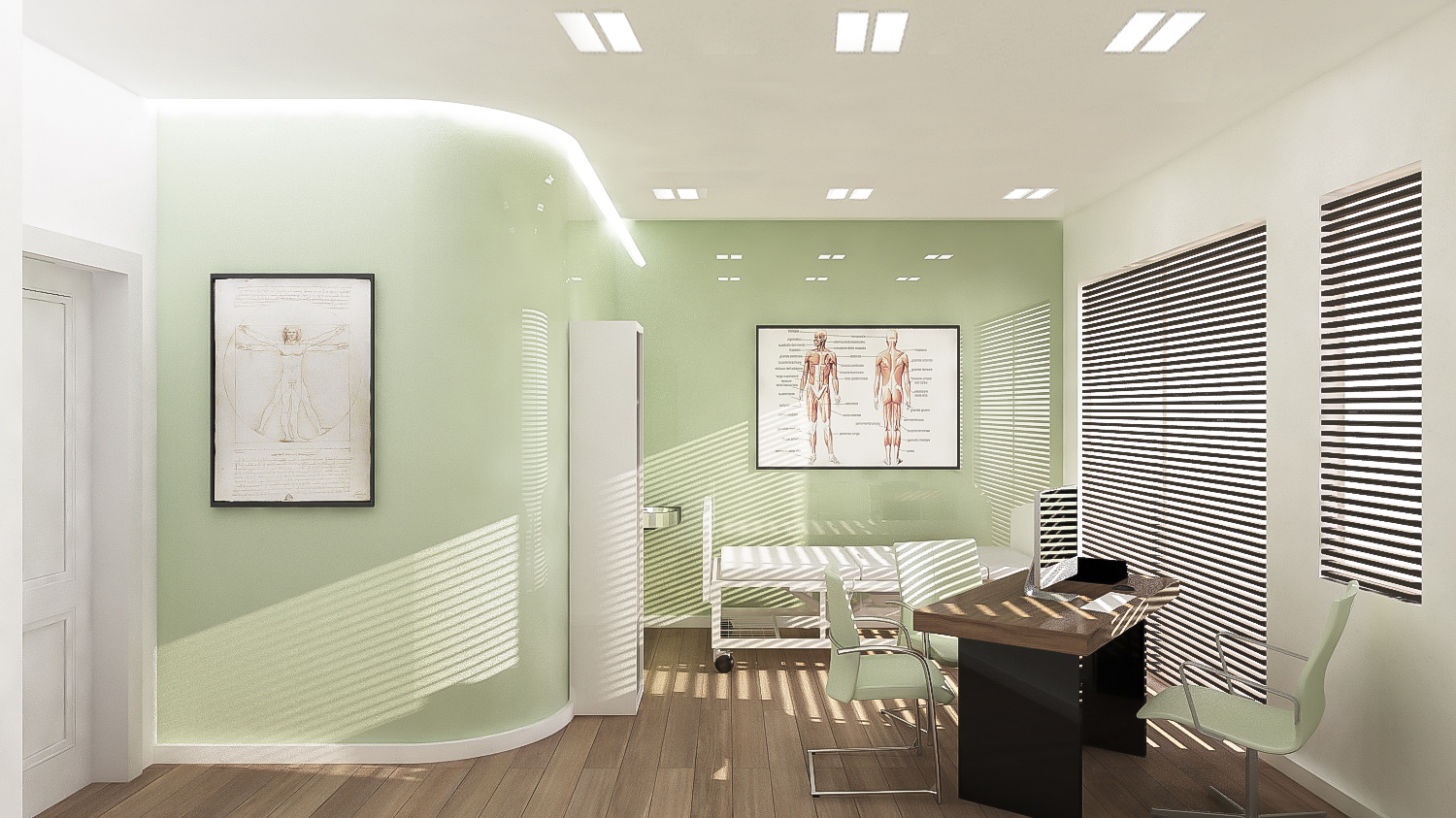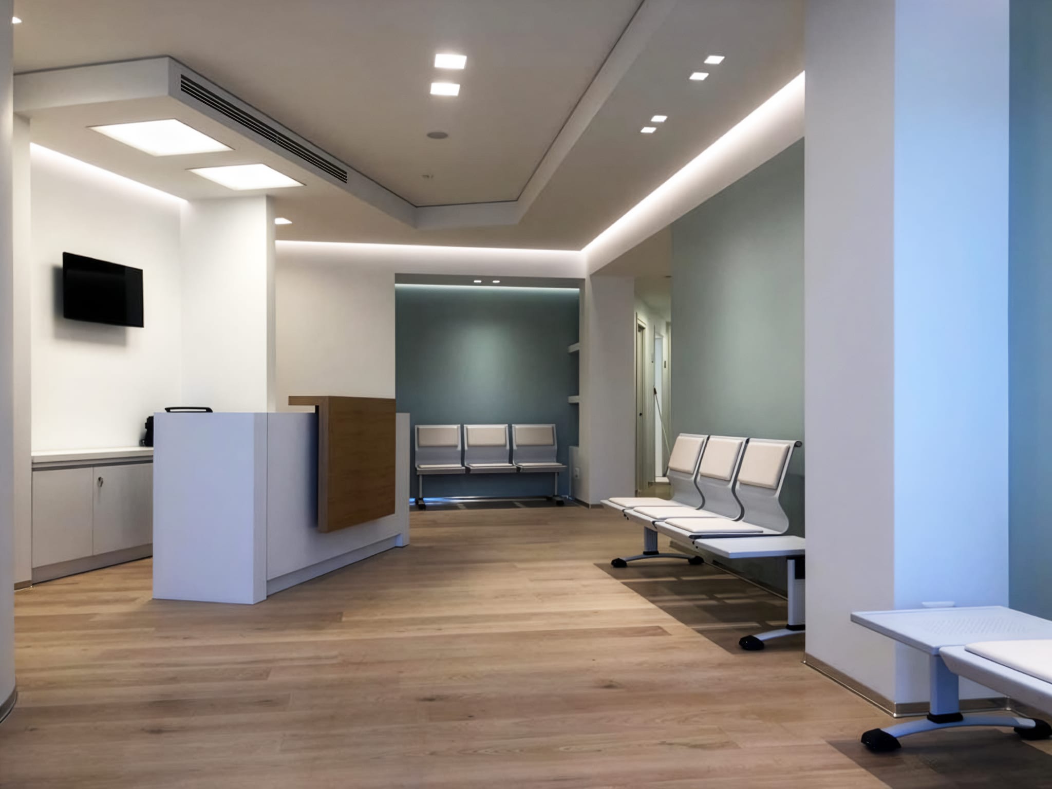 - Dominanza del Bianco: Il bianco ottico è stato scelto come colore principale per pareti e soffitti, massimizzando la diffusione della luce e riflettendo gli standard di pulizia richiesti da una struttura sanitaria.