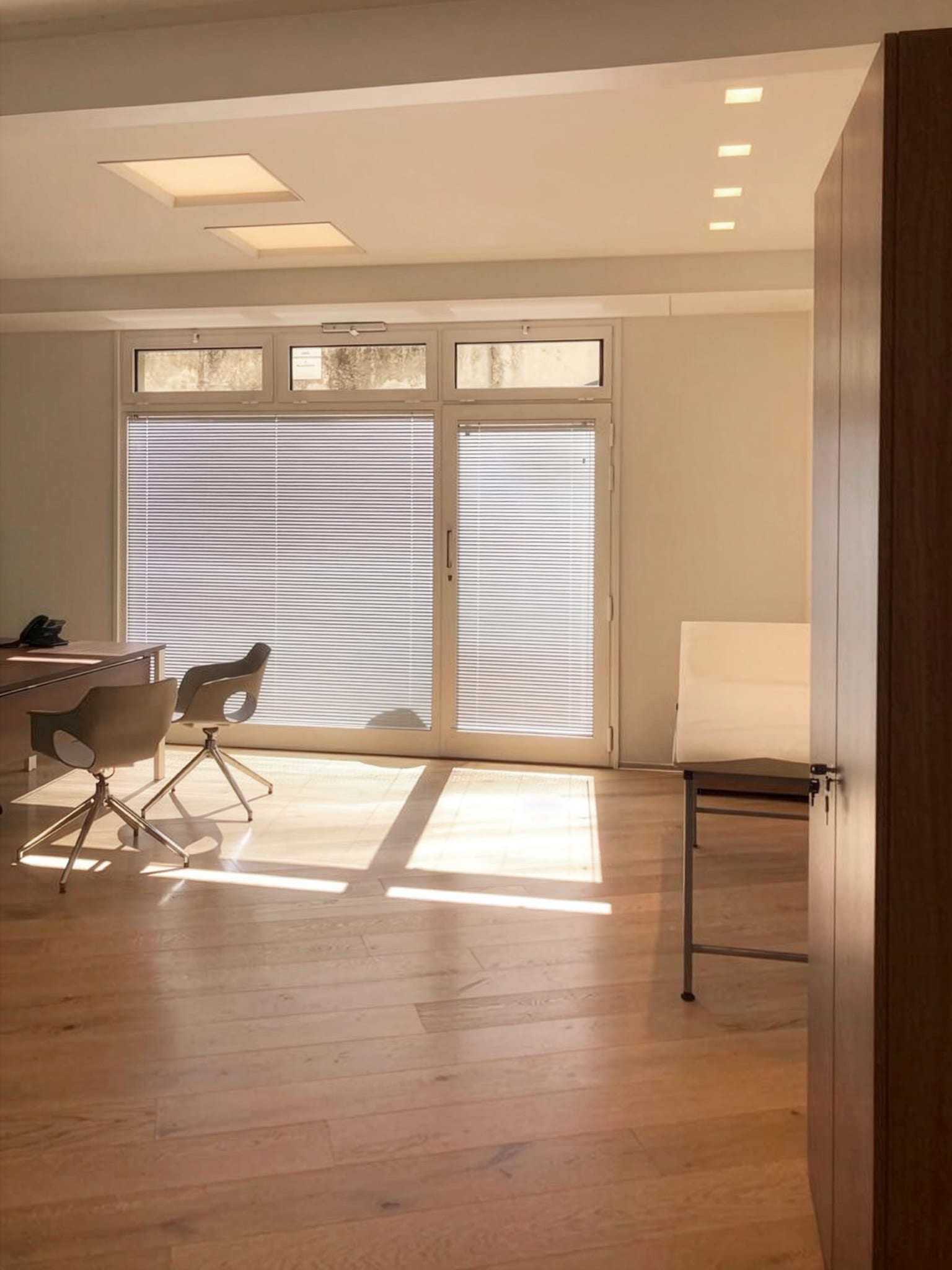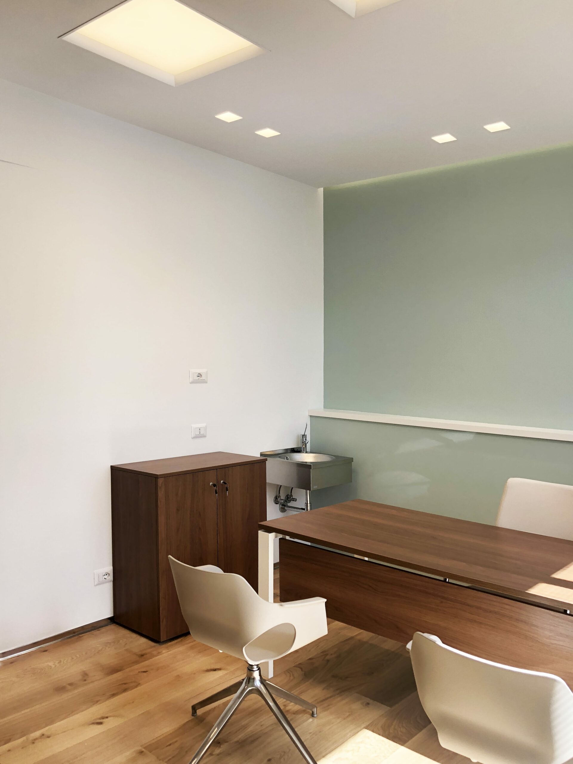 - Accento Cromatico Identitario: Un verde pastello tenue (verdolino) è stato introdotto come colore di accento per legare visivamente gli studi e le aree comuni, infondendo un tocco di colore che coniuga serenità e identità aziendale.